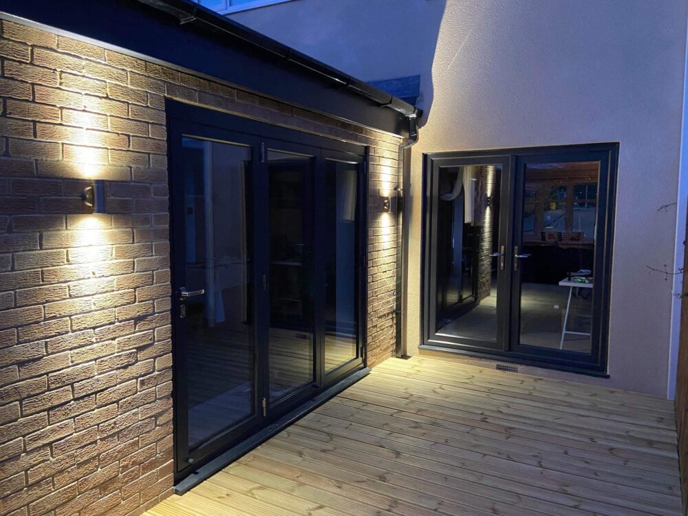 High Quality bi-folding doors with a thermally broken system ensuring a warmer drier home Weather rated system tested to withstand the worst of the weather Long lasting powder coated aluminium bifolds in a choice of popular RAL finishes Stainless steel rollers for smooth operation Secure 3 point locks, glides that prevent doors being levered out,safe and secure. Frames and tracks on our bi-folding doors are amongst the narrowest available. Each door is manufactured with state of the art technology that meets all British standard tests.